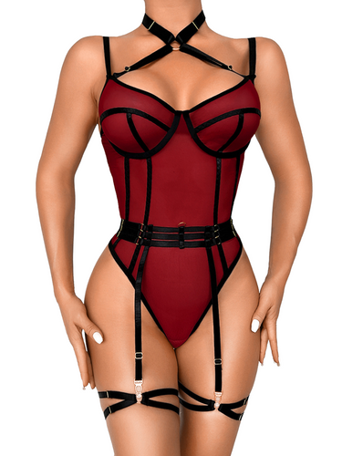 Kaei&Shi Floral Embroidered Mesh,Underwire,Removable Garter,Thigh Straps,Backless Bodysuit